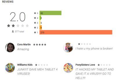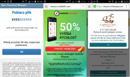 Una vez abiertas, estás aplicaciones muestran una pantalla con un botón de descarga que una vez seleccionado se redirige al usuario a un sitio web. Estos sitios muestran todo tipo de contenido que va desde anuncios, encuestas, ofertas, cupones gratuitos, premios, pornografía, hasta falsas actualizaciones y alertas de virus que intentan asustar al usuario. Los mensajes se muestran en diferentes idiomas, basándose en las direcciones IP de los usuarios.