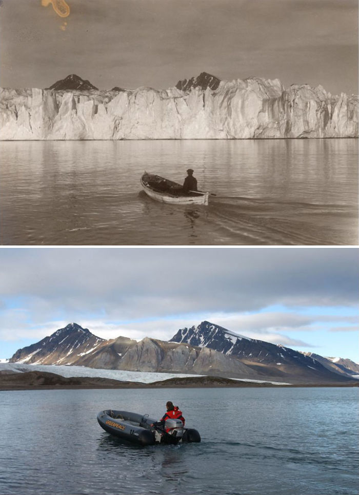 Christian Åslund, un fotoperiodista sueco que trabaja con Greenpeace, ha recopilado algunas fotos antiguas del Instituto polar noruego en la que se ven los glaciares de Svalbard, y junto a ellas ha colocado sus propias fotos en el mismo sitio, tomadas en 2002. Las diferencias son increíbles. Está usando estas fotos para promover #MyClimateAction, una campaña de National Geographic que anima a discutir sobre el cambio climático, y a protestar contra las compañías petroleras noruegas que están perforando en el Ártico.