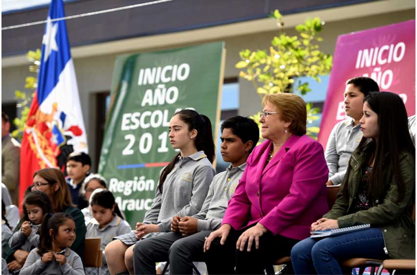 La Mandataria explicó que en la Región de la Araucanía ya hay 17 colegios y escuelas que dejaron de cobrar mensualmente a las familias gracias al fin del copago. En total, con la ley de inclusión el 96% de la matrícula escolar de la región tiene educación gratuita.