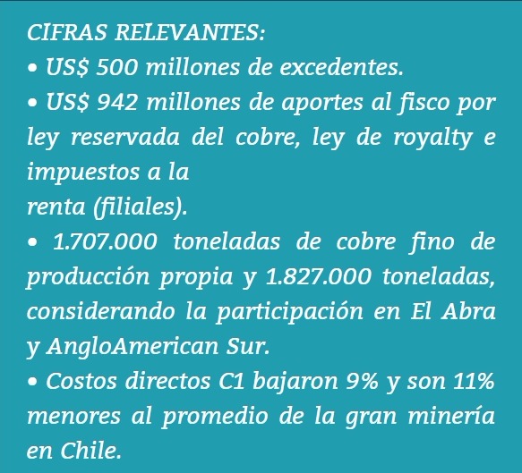 En cuanto a los aportes al fisco, la cuprífera entregó US$ 942 millones de dólares (US$ 917 millones por la Ley Reservada del Cobre y US$ 5 millones por impuesto a la renta (filiales) y US$ 20 millones por la Ley de Royalty).