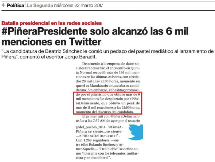 Pero ¡Sorpresa mayúscula! Y “De acuerdo a la empresa de datos sociales Brandmetric, el encuentro en Quinta Normal recopiló más de 146 mil menciones en las últimas 24 horas, con alrededor de 29 mil a las 21:00 horas, momento en que el ex Mandatario anunciaba su candidatura. Sin embargo, el hashtag promovido por el piñerismo (#PiñeraPresidente) que obtuvo más de 6 mil menciones fue desplazado por #PiñeraDelincuente, que obtuvo un peak de más de 11 mil reacciones a las 21:00 horas, momento del discurso del candidato”, reseña el diario de los Edwards.