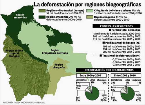 , dice Neues Deutschland, basado en la Fundación Tierra. Solo entre los años 2000 y 2015 Bolivia ha perdido 3,26 millones de hectáreas de bosques naturales, como informa el Ministerio boliviano de Medio Ambiente. Y Evo Morales, el primer presidente indígena de Bolivia, tampoco ha cumplido frenando esta implacable política de deforestación.