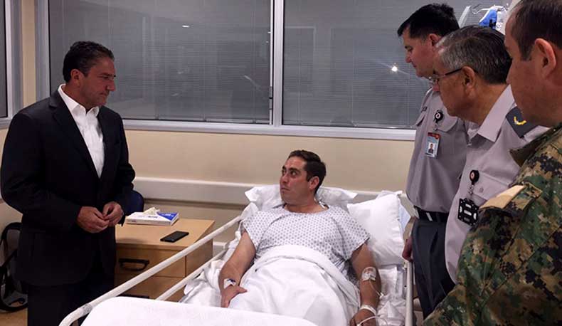 Este viernes el Ministro de Defensa Nacional, José Antonio Gómez, concurrió hasta el Hospital Militar para visitar y percatarse del real estado de salud del desminador. En la instancia, la autoridad ministerial expresó su agradecimiento por la importante, voluntaria y peligrosa labor que realizan en sus respectivas unidades de desminado, alejados de sus familias y lidiando con estos peligrosos artefactos, todo para lograr un Chile libre de minas antipersonales.