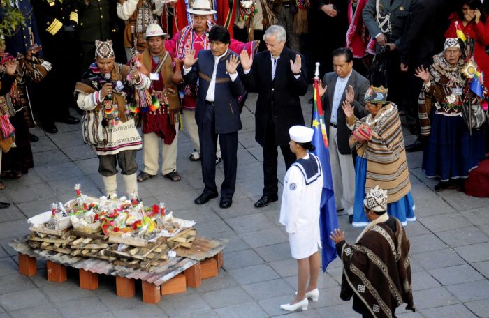 A primera hora de este martes Morales encabezó un ritual andino que se realizó en la plaza Murillo, mientras se entregaba la réplica boliviana a la Corte Internacional de Justicia (CIJ). La demanada -según una nota oficial paceña emitid este marte- «pidió que Bolivia retorne al mar con soberanía».