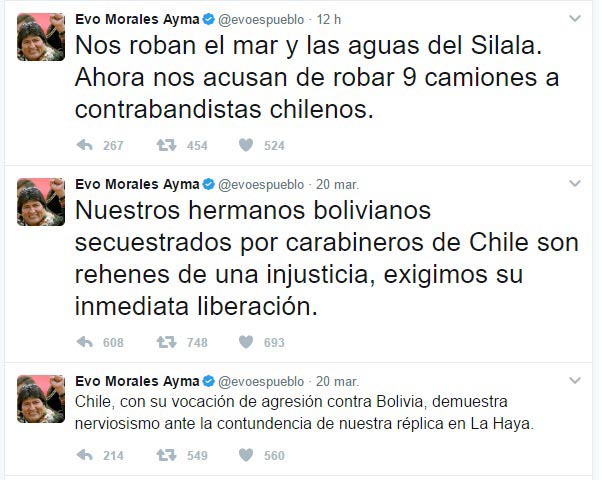 Quizás es el efecto de los vapores de los sahumerios de esta mañana en La Paz, provocó que el Presidente Evo Morales lanzará nuevos y uros ataques verbales contra Chile:»Nos roban el mar y las aguas del Silala. Ahora nos acusan de robar nueve camiones a contrabandistas chilenos».
