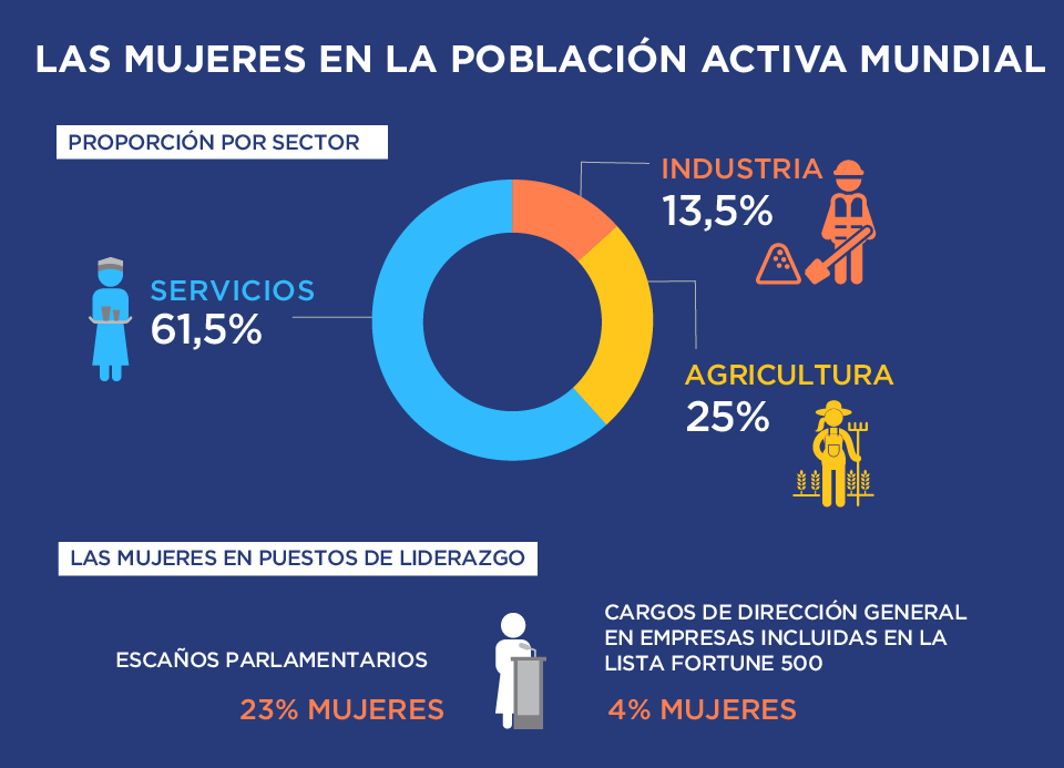 En este contexto, apenas el 50 por ciento de las mujeres en edad de trabajar están representadas en la población activa mundial, frente a un 76 por ciento en el caso de los hombres. Es más, una abrumadora mayoría de las mujeres trabaja en la economía informal, subvencionando el trabajo de cuidados y doméstico, y se concentran en empleos peor remunerados y con menos cualificaciones, con poca o ninguna protección social. Lograr la igualdad de género en el trabajo es indispensable para el desarrollo sostenible.