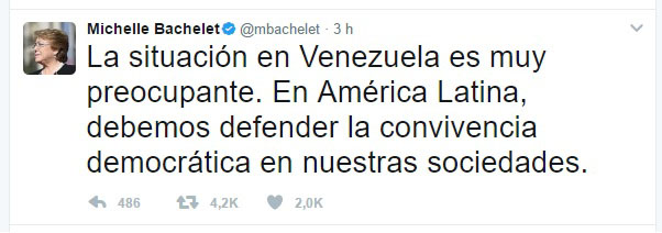 En horas de la tarde de este jueves y desde Portugal, la Presidenta Bachelet en su cuenta de Twitter escribió: «La situación en Venezuela es muy preocupante. En América Latina, debemos defender la convivencia democrática en nuestras sociedades».