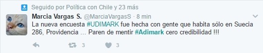 De esta forma, Marcia Vargas coloca en su cuenta que “la nueva encuesta #UDIMARK fue hecha con gente que habita solo en Suecia 286, Providencia… Paren de mentir #Adimark cero credibilidad!!!”.