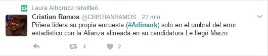 Cristian Ramos pone “Piñera lidera su propia encuesta (#Adimark) solo en el umbral del error estadístico con la Alianza alineada en su candidatura. Le llegó Marzo”.