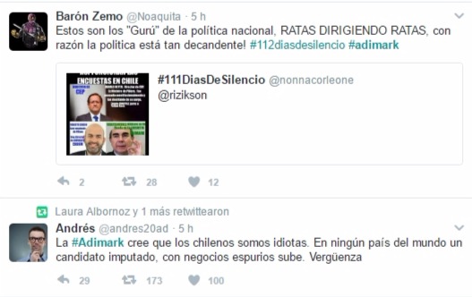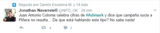 Por su parte, Jonathan Navarrete señala que “Juan Antonio Coloma celebra fifras de #Adimark y dice que campaña sucia a Piñera no resulta… De que está hablando este tipo? No sabe nada!”.