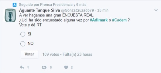 Hoy se dio a conocer la encuesta Adimark correspondiente al mes de febrero y que muestra que Sebastián Piñera sigue liderando las preferencias de los entrevistados con un 29%, seguido por el senador Alejandro Guillier con 25%, pero Twitter explotó con reacciones y dudas a la veracidad del sondeo, ya que muchos internautas apuntaron a que no muestra la verdadera realidad que afecta al ex Presidente luego de conocerse sus inversiones en la Minera Dominga y el caso Exalmar.