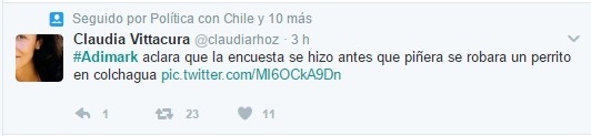 En tanto, Claudia Vittacura señala que “#Adimark aclara que la encuesta se hizo antes que Piñera robara un perrito en Colchagua”.