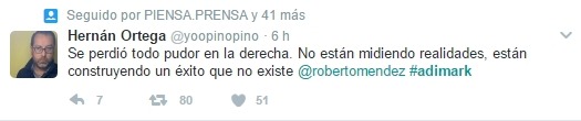 Mario Aguilar también cuestiona la veracidad de la encuesta al escribir en su cuenta que “así como a Pinocho cuando miente le crece la nariz a Roberto Méndez le crecen las cejas #Adimark”.
