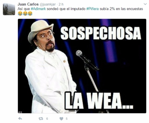 Juan Carlos menciona que “Así que #Adimark sondeó que el imputado #Piñera subía 2% en las encuestas ”.