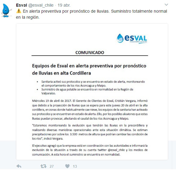 Por su parte la sanitaria de la Quinta Región, Esval (capitales de jubilados canadienses) también se declaró, vía Twitter, en «En alerta preventiva por pronóstico de lluvias. Suministro totalmente normal en la región». Pero, a diferencia de Aguas Andinas, Esval emitió la alerta el miércoles 19 de abril.