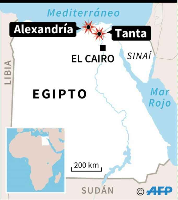Horas antes, un primer atentado dejó 27 muertos y 78 heridos en la iglesia Mar Girgis de Tanta, 120 kilómetros al norte de El Cairo, en el delta del Nilo.