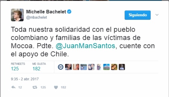A través de su cuenta en Twitter, la mandataria escribió “Toda nuestra solidaridad con el pueblo colombiano y familias de las víctimas de Mocoa. Pdte. @JuanManSantos, cuente con el apoyo de Chile.”