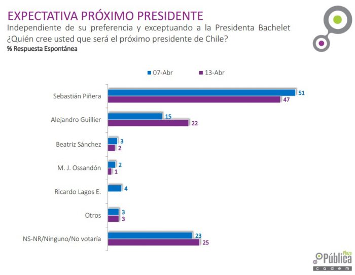 Ante la pregunta ¿Quién cree que será el próximo Presidente? Piñera baja 4 puntos : 47%. En tanto Aljandro Guillier sube 7 puntos y logra un 22%. Beatriz Sánchez aja un punto y queda en 2% y Ossandón también baja de 2 a 1%.