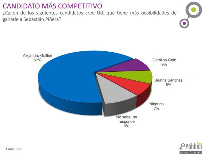 Ante la pregunta sobre qué candidato o candidata es más competitivo para ganarle a Piñera, lidera Guiller con 67%, seguido por Goic con 9%, pisándole la cola Sánchez con 8%. El resto de los candidatos ninguna mención.