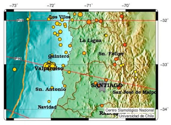 Una secuencia de sismos sensibles se ha dejado sentir en las costas de la Región de Valparaíso desde el 22 de abril de 2017. El primer sismo, de magnitud 4.8, ocurre a las 19:59:56 horas y, desde entonces, se registraron seis sismos de menor magnitud, incluyendo un evento M4.8 a las 22:49 horas. A las 23:36 ocurre el mayor de la secuencia, de magnitud 5.9, frente a las costas de Valparaíso. Entre el comienzo de la serie y aquel de mayor magnitud ocurren 15 sismos localizados y publicados por el CSN hasta el momento (todos ellos de magnitud > 2.5) prácticamente en el mismo lugar, entre 30 y 40 km al oeste de Valparaíso (ver Fig. 1).
