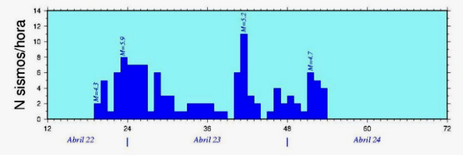 Posteriormente al sismo M5.9 ocurren más de 40 réplicas localizadas y publicadas por el CSN en las siguientes 14 horas, tal como se evidencia en la Fig. 2. El número de sismos por unidad de tiempo, en este caso por hora, muestra que la secuencia se comporta como escenarios que se han observado en otros terremotos en el pasado. En particular, una secuencia similar a ésta ocurrió en junio de 2003 asociada a un sismo de magnitud 5.5.