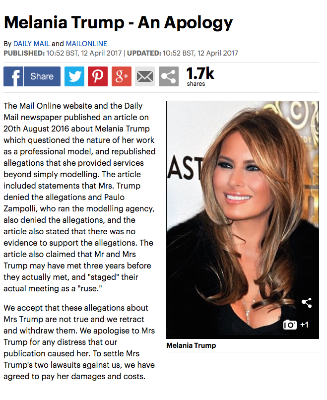 El texto, dice el acuerdo judicial sellado por ambas partes, incluye «falsas y difamatorias afirmaciones sobre la señora Trump que cuestionaban la naturaleza de su trabajo como modelo profesional y volvían a sugerir que ella prestaba servicios más allá del simple modelaje». El periódico también ha publicado una disculpa e informado sobre el acuerdo alcanzado en su página web.
