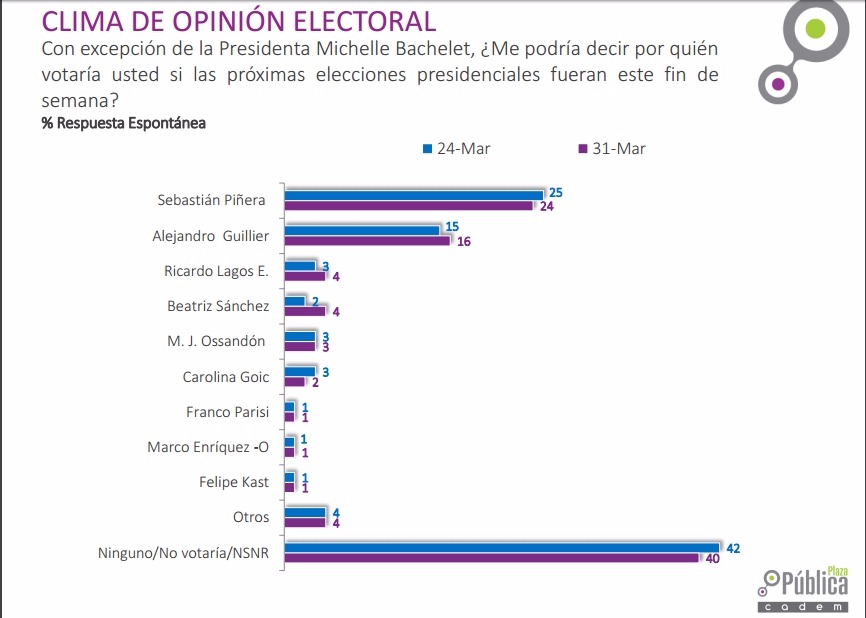 Totalmente líquida está la campaña presidencial, ya que la encuesta Plaza Pública Cadem muestra que Piñera se mantiene en primer lugar con un 24%, seguido por Alejandro Guillier con un 16%. Sin embargo, lo llamativo de este sondeo semanal es que a sólo dos semanas de mostrarse disponible de asumir el desafío, la periodista Beatriz Sánchez alcanza un 4% (sube dos) empatando con Ricardo Lagos y superando a Manuel José Ossandón (3%) y a Carolina Goic (2%).