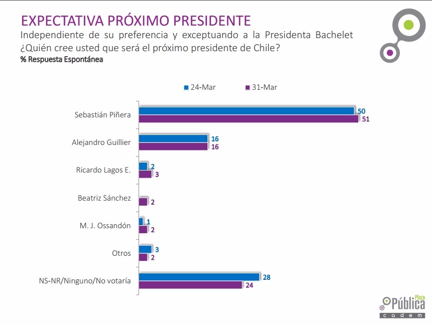 En cuanto a la expectativa de quién será el próximo Presidente, ante la pregunta ¿Quién cree usted que será el próximo presidente de Chile?, el 51% estima que será Piñera, un 16% Guillier y solamente un 3% Lagos.