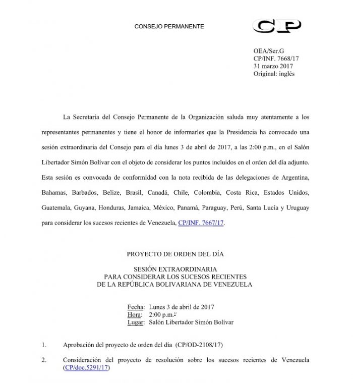 La OEA de todos modos se reunirá este lunes bajo la siguiente citación: «La Secretaría del Consejo Permanente de la Organización saluda muy atentamente a los representantes permanentes y tiene el honor de informarles que la Presidencia ha convocado una sesión extraordinaria del Consejo para el día lunes 3 de abril de 2017, a las 2:00 p.m., en el Salón Libertador Simón Bolívar con el objeto de considerar los puntos incluidos en el orden del día adjunto. Esta sesión es convocada de conformidad con la nota recibida de las delegaciones de Argentina, Bahamas, Barbados, Belize, Brasil, Canadá, Chile, Colombia, Costa Rica, Estados Unidos, Guatemala, Guyana, Honduras, Jamaica, México, Panamá, Paraguay, Perú, Santa Lucía y Uruguay para considerar los sucesos recientes de Venezuela».