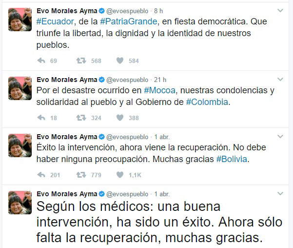 Hasta ahora no han habido fotografías que muestren a Morales en su proceso de recuperación, sólo varios tuits: