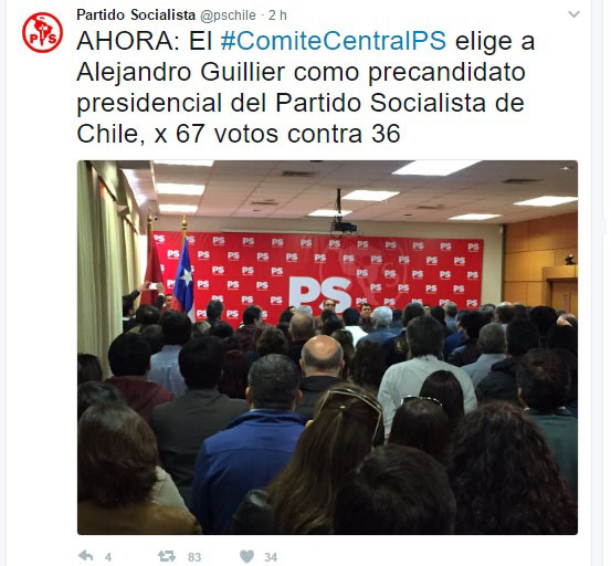 «El candidato del Partido Socialista a la primaria de la Nueva Mayoría es Alejandro Guillier», informó el presidente del PS, Álvaro Elizalde, tras el sufragio que se desarrolló en el estadio El Llano en la comuna de San Miguel. El nuevo timonel de la colectividad reiteró su llamado a la unidad en el partido y en la Nueva Mayoría, de cara a las elecciones de noviembre de este año.