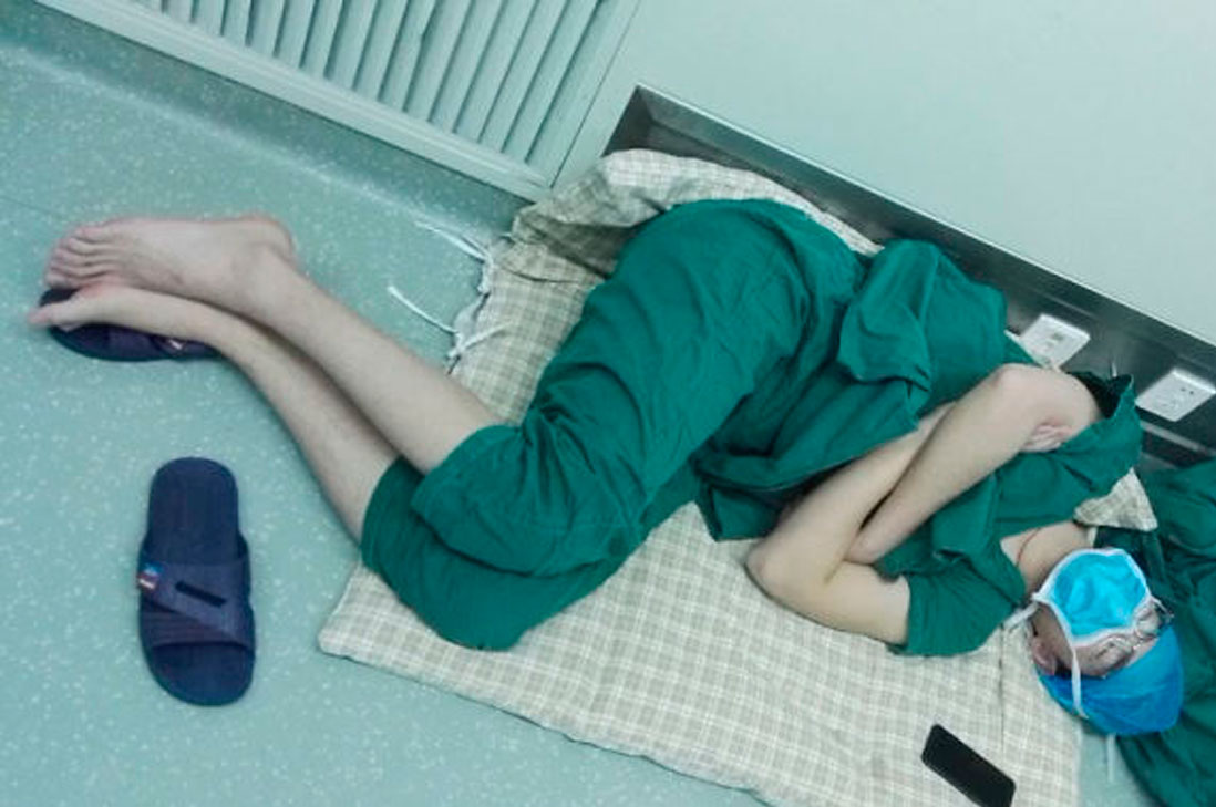 Ser médico no es solo un trabajo duro, también es agotador. El cirujano Luo Heng llevó a cabo 5 operaciones en un total de 28 horas. 2 de ellas fueron emergencias nocturnas y otras 3 fueron por la mañana. Después de un turno tan duro, Heng fue visto durmiendo en el suelo del hospital de forma bastante cómoda. La foto se publicó en una red social china llamada Weibo, y desde entonces la gente ha estado alabando su dedicación al trabajo.