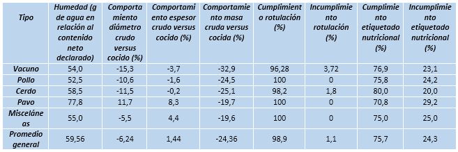- En la evaluación del etiquetado nutricional, que consideró el cumplimiento de la tolerancias establecidas en el Reglamento Sanitario de los Alimentos, es decir: energía, proteínas grasa total, hidratos de carbono, azúcares totales y sodio, se evidenció que las hamburguesas que presentan mayor cumplimiento son las de cerdo, con 80%; y las con menor cumplimiento son las de pavo, con un 29,2%.