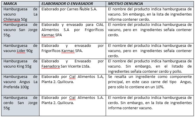 - El análisis detectó inconsistencias en la denominación del alimento, específicamente hamburguesas que declaran contener un tipo de carne, sin embargo en el listado de ingredientes indica otros componentes.