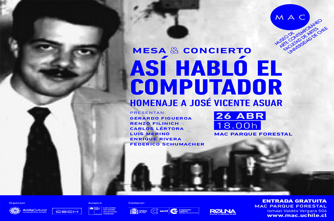 El Museo de Arte Contemporáneo, Anilla MAC y la Comunidad Electroacústica de Chile (CECh), presentan Así habló el computador, un homenaje al músico José Vicente Asuar (1933-2017). En la ocasión, se ofrecerá un concierto acusmático de sus dos piezas más significativas: Serenata para mi propia voz y Amanecer. Además, se realizará una mesa redonda, donde participarán Renzo Filinich, coordinador de la CECh, Gerardo Figueroa, Carlos Lértora, Luis Merino, Enrique Rivera y Federico Schumacher. La actividad se llevará a cabo este miércoles 26 de abril a partir de las 18:00 hrs en el MAC Parque Forestal.