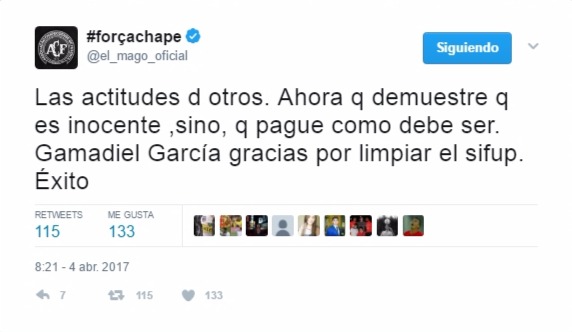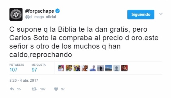 Luego volvió a apuntar que “C supone q la Biblia te la dan gratis, pero Carlos Soto la compraba al precio d oro.este señor s otro de los muchos q han caído,reprochando” y concluyó con “Las actitudes d otros. Ahora q demuestre q es inocente ,sino, q pague como debe ser. Gamadiel García gracias por limpiar el sifup. Éxito«.