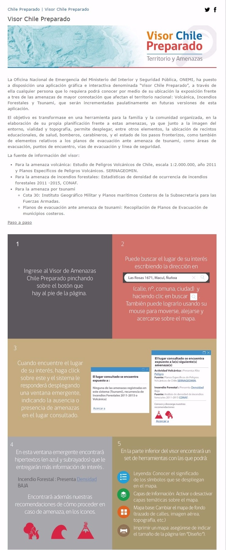 Otro aspecto importante dado a conocer por la Onemi es la publicación de una aplicación gráfica e interactiva llamada “Visor Chile Preparado”, en que está diseñado para que las personas conozcan las amenazas que podrían afectarlos como es el caso de volcanes, incendios forestales y tsunamis.