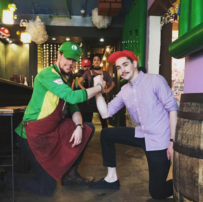 Una vez que entras al bar, sentirás las nostalgia desde el primer momento… Bloques de 8-bit con interrogaciones, setas colgando del techo, tuberías verdes… y hasta los camareros van disfrazados de Mario y Luigi.