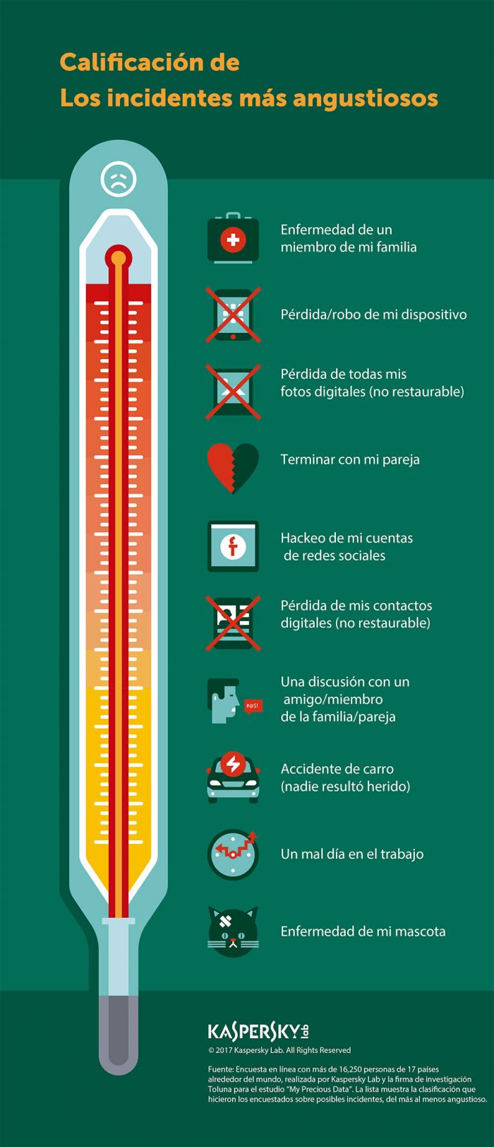 Al indagar sobre el nivel de angustia que sentirían en diferentes situaciones — entre ellas la enfermedad de un miembro de la familia, una ruptura de pareja, un accidente automovilístico, o la pérdida de sus fotos digitales — la enfermedad de un miembro de la familia ocupó el primer lugar como el incidente más doloroso que podrían experimentar. Sin embargo, la pérdida o el robo de un dispositivo y la pérdida de fotos digitales ocuparon el segundo y el tercer lugar, lo que dejó por debajo en la lista a los accidentes automovilísticos, una ruptura con la pareja, un mal día en el trabajo, peleas con familiares y amigos e, incluso en algunos casos, la enfermedad de una mascota.