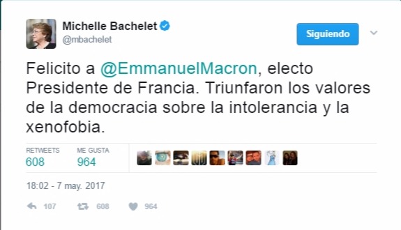 A través de su cuenta en Twitter, la jefa de Estado escribió: «Felicito a @EmmanuelMacron, electo Presidente de Francia. Triunfaron los valores de la democracia sobre la intolerancia y la xenofobia«.