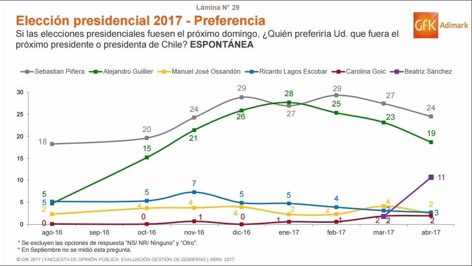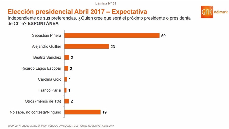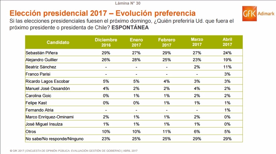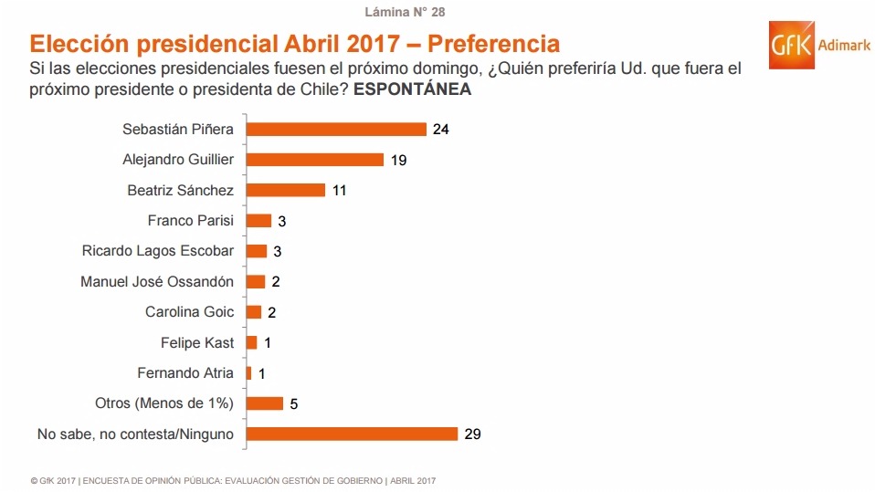 El sondeo muestra que el abanderado de la derecha, Sebastián Piñera se mantiene en el primer lugar con un 24% de preferencias, lo que representa una caída de 3 puntos respecto al mes anterior, siendo seguido por Alejandro Guillier con 19% y una baja de 4 puntos.