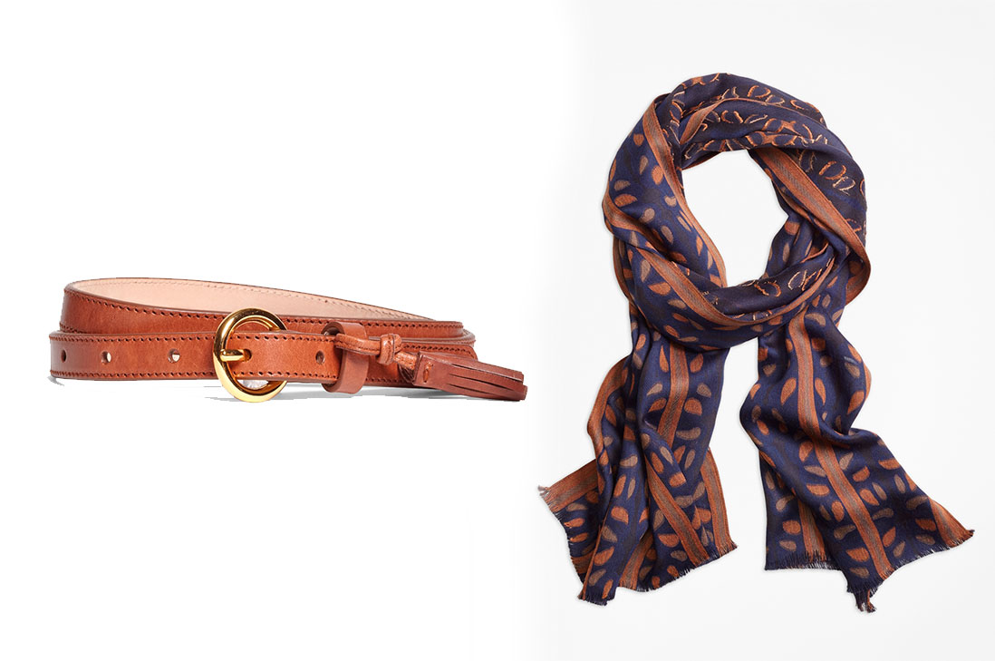 El cinturón es de cuero Trouser con flecos decorativos. Es un diseño delgado de la colección Red Fleece, tiene la hebilla dorada redonda. La cartera es de cuero Saffiano y pertenece a la misma colección que el cinturón, tiene correa ajustable de 61 cm, además de un compartimiento doble y bolsillo pequeño con cierre en el interior.