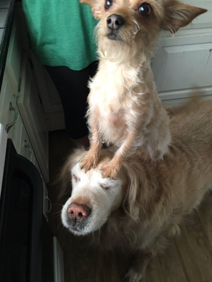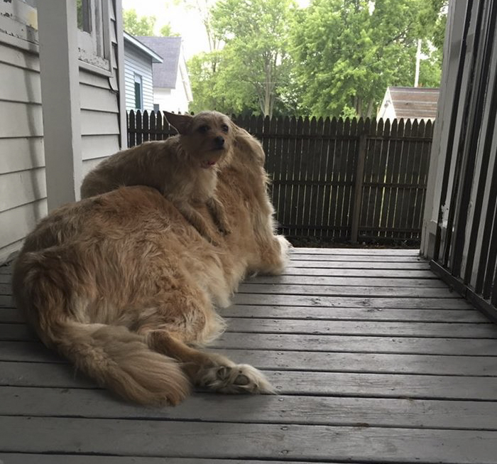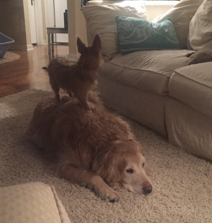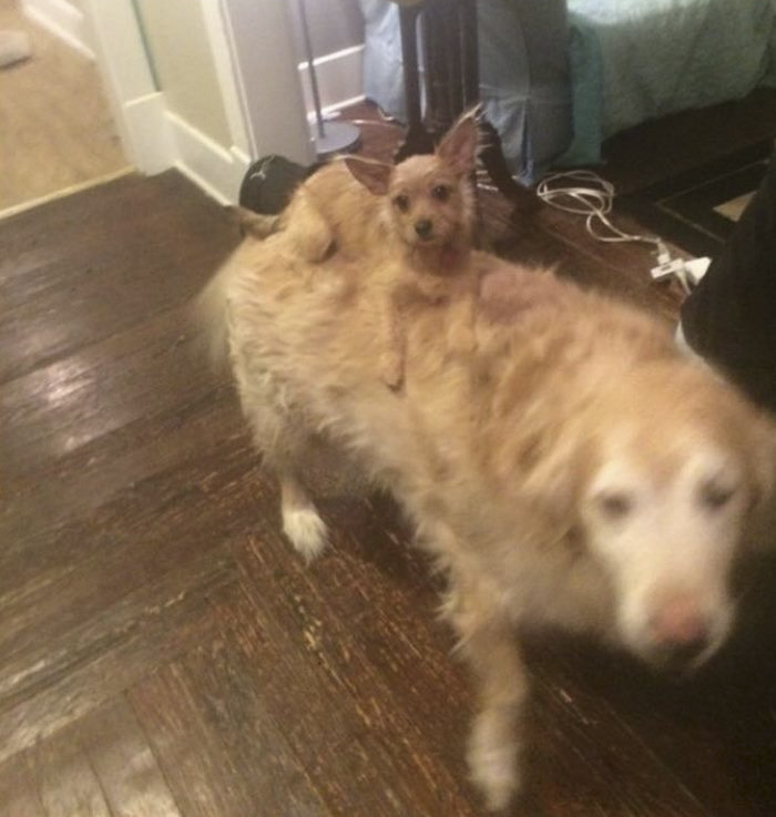 Bella es muy ingeniosa y se dio cuenta de lo grande que era Hank. Así que Bella pasa la mayor parte del tiempo encima de Hank. Para dormir, para ir por la casa o para pedir comida, parecen 2 partes de un mismo cuerpo.