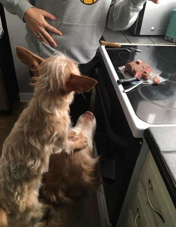 “Hank se está haciendo viejo, así que es bueno que tenga a Bella para mantenerse activo,” dice Adriana. “Ella se entretiene, pero lía a Hank mientras lo hace. Corre con ella, pero cuando se cansa se sienta y entonces ella se le sube encima un rato. Son los mejores.”