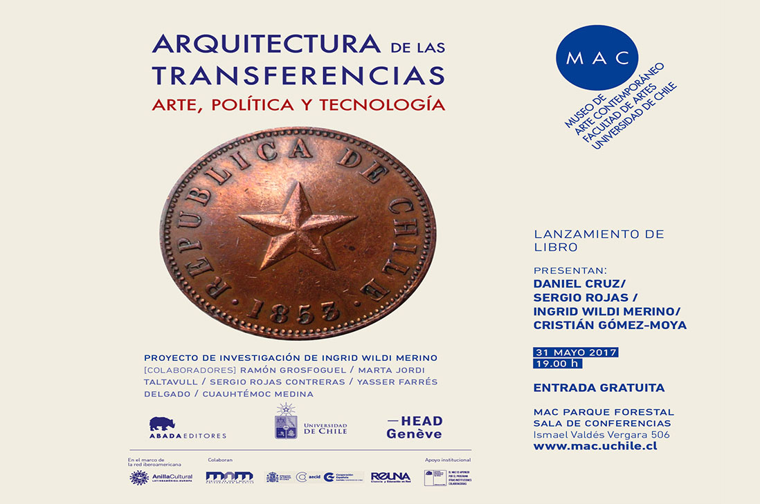 El próximo miércoles el 31 de mayo a las 19 horas, se realizará la presentación del libro y proyecto curatorial Arquitectura de las Transferencias: Arte, Política y Tecnología, en la Sala de Conferencias de MAC Parque Forestal. La artista Ingrid Wildi, autora de la iniciativa, junto al artista visual Daniel Cruz, el diseñador gráfico Cristián Gómez-Moya y el filósofo Sergio Rojas, conversarán sobre los temas en los que indaga el proyecto: las propiedades físicas y simbólicas del material cobre y lo que significa en términos globales actuales.
