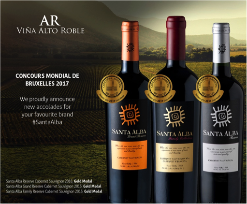 Un gran reconocimiento recibió Viña Alto Roble, de Sur Valles Wine Group, con sus vinos Santa Alba Grand Reserve Cabernet Sauvignon 2015, Santa Alba Family Collection Cabernet Sauvignon-Cabernet Franc 2016 y Santa Alba Reserve Cabernet Sauvignon 2016 que recibieron Gran Medalla de Oro en la última edición del Concours Mondial de Bruxelles 2017.