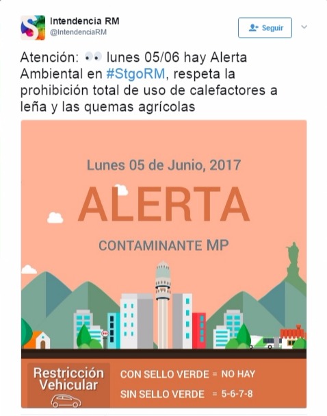La Intendencia Metropolitana decretó para mañana lunes Alerta Ambiental, debido a las malas condiciones de ventilación y con el objeto de resguardar la salud de la ciudadanía.
