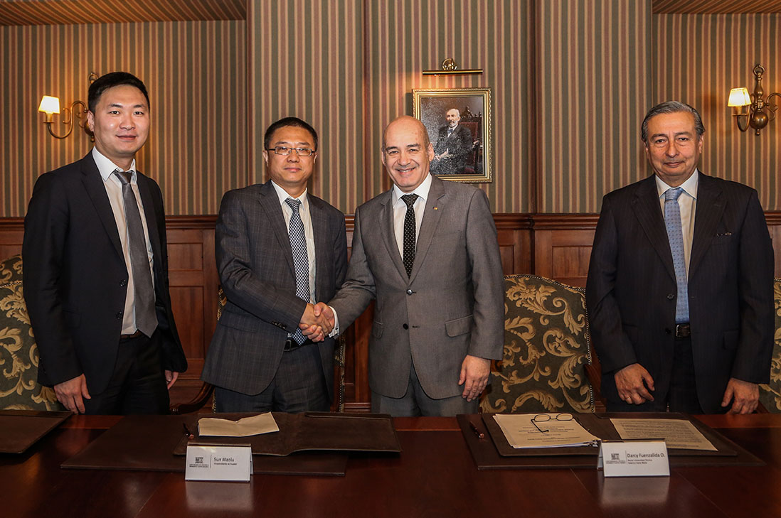 El acuerdo con la empresa multinacional china, especializada en investigación y desarrollo de tecnología en comunicaciones, fue firmado por el Rector de la USM, Darcy Fuenzalida, el Director de Vinculación con el Medio de la Universidad, Patricio Núñez, el Vicepresidente Global de servicios de Huawei, Zhang Guijun y el CEO de Huawei Chile, Qin Hua, durante una visita de los dirigentes de la compañía a la Institución en Valparaíso.