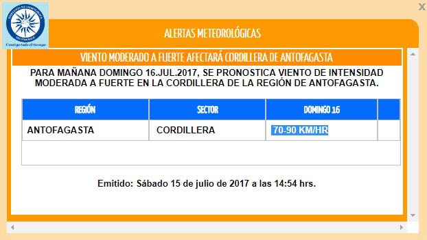 El organismo dependiente de la Dirección de Aeronáutica Civil emitió la siguiente Alerta Meteorológica: “Viento moderado a fuerte afectará cordillera de Antofagasta. Para mañana domingo 16.jul.2017, se pronostica viento de intensidad moderada a fuerte en la cordillera de la región de Antofagasta, entre los 70-90 KM/HR”.