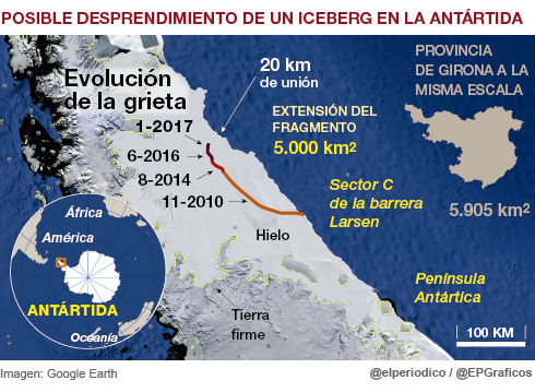 «Si Larsen C empieza ahora a reducirse significativamente y finalmente colapsa, habrá otra contribución a la subida del nivel de los océanos», añadió.